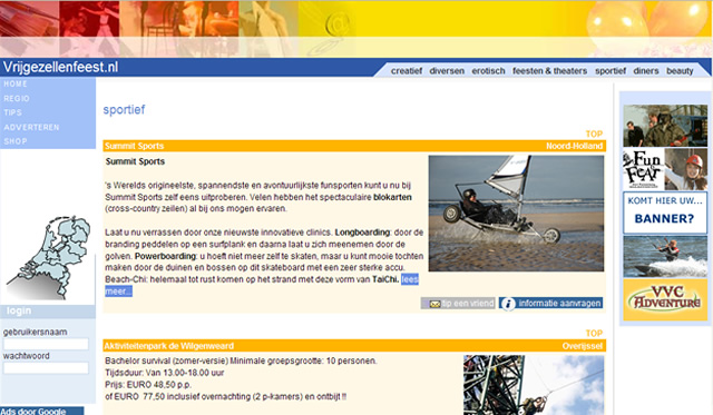 webdesign vrijgezellenfeest.nlVrijgezellenfeest.nl: De website Vrijgezellenfeest.nl, een portaal voor het organiseren van een vrijgezellenfeest is door Archytas van de grond af aan opnieuw opgebouwd. De site is op basis van ons eigen CMS, vrijwel alles is aanpasbaar en meetbaar. De site is zoekmachinevriendelijk en trekt dagelijks vele geïnteresseerde bezoekers.